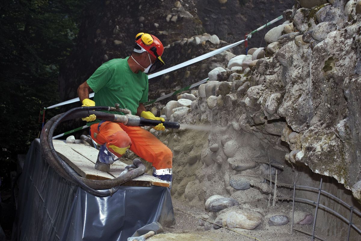 Die bautechnischen Vorgaben erstellten die Denkmalpflege und der Archäologische Dienst des Kantons Bern. Die Mauer besteht im Kern aus Bollensteinen (ø 15 cm), welche mit Spritzbetonmörtel zusammengehalten werden. Der Kern wird wiederum mit einer Schutzhülle aus gespritztem Mörtel abgeschlossen. Deren Oberfläche war so zu gestalten, dass sie den historischen Charakter vermittelt. Nebst Angaben zum Aufbau der Mauer waren auch die Rezepturen der Verputze aus Kalk und Weisszement zu befolgen, sie wurden von unserem Team vor Ort gemischt. Die Arbeiten erfolgten in sehr steilem Gelände. Die Baumaterialientransporte durften so nur mit kleinen Fahrzeugen ausgeführt werden und waren dementsprechend aufwändig. Die Erosion durch Schnee und Eis setzt diesem historischen Zeitzeugen zu. Mit der Sanierung erhalten wir ein Stück Geschichte unserer Region.
