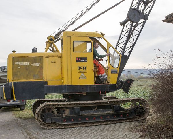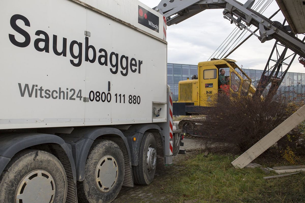 Kürzlich erhielt die Witschi AG den Auftrag, den Schacht wieder vom Geröll zu befreien. Da kein Plan über die Dimensionen des Schachtes bestand, wussten wir nicht, welches Geröllvolumen uns erwartete. Wir begannen mit dem Saugbagger mit senkrecht hängendem Schlauch das aufgefüllte Material herauszusaugen. Der Schacht hatte bis 5 Meter Tiefe einen Durchmesser von einem Meter, danach nur noch 80 cm. In einer Tiefe von 17 Metern stiessen wir auf Grundwasser. Da im Grundwasser nicht mit dem Saugbagger gesogen werden kann – man würde nur Wasser einsaugen –, war eine andere Lösung gefragt. Wir entschieden uns, den Grossonkel des Saugbaggers einzusetzen: den 47-jährigen P + H Seilbagger.