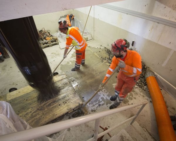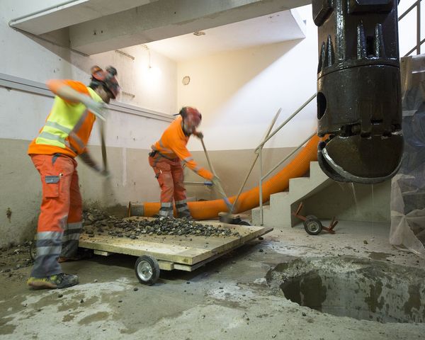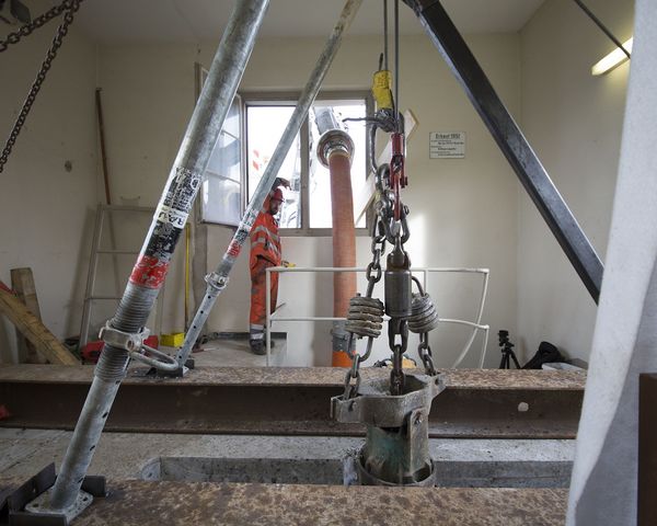 Der Schacht befindet sich im Keller und ist mit dem Seilbagger nicht direkt erreichbar. Deshalb und weil das Gebäude von 1951 seitlichen Umlenkkräften nicht standhält, bauten wir eine Konstruktion, welche die Vertikalkräfte in Horizontalkräfte umleitet, ohne das Gebäude zu belasten. Das Trag- und das Arbeitsseil des Seilbaggers wurden über vier Umlenkrollen in den Schacht geführt. Somit hatten wir an der Tragkonstruktion ein Zuggewicht von gut fünf Tonnen. Dafür mussten unsere Bauwerktrenner ein grosses Loch in den Boden schneiden.