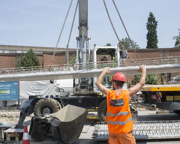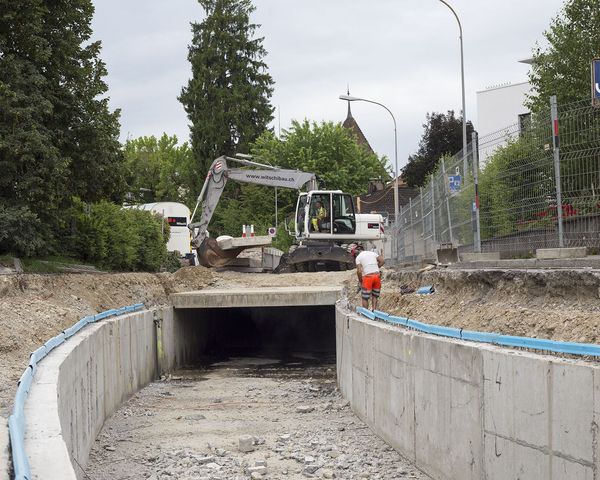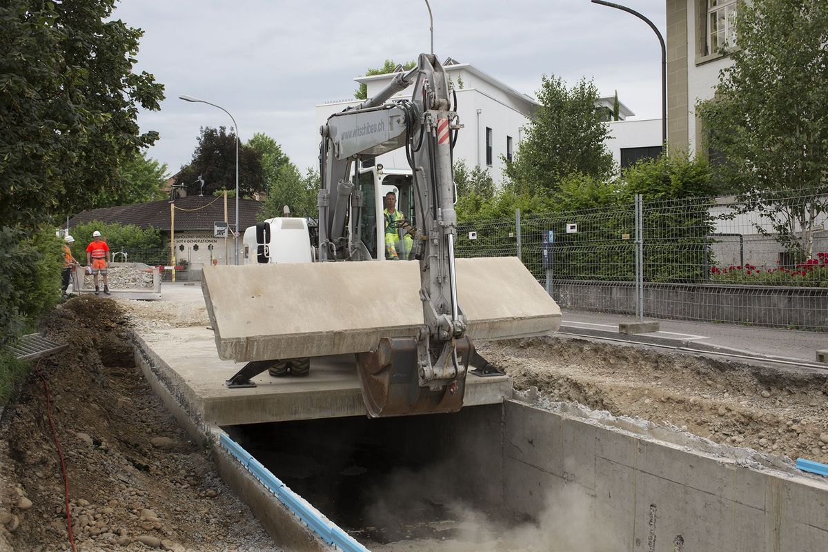 Unter dem untersten Teil der Bahnhofstrasse wurde der Kanal, von dem viele Langenthaler gar nicht wissen, dass er existiert, im Sommer 2017 freigelegt. Das von Geschäftsleitungsmitglied Roman Gerber und Polier André Gabi geleitete Team entfernte die alten Deckenplatten und sanierte die Kanalwände. Dann wurden die vorgefertigten neuen Deckenplatten eingesetzt und auf eine Höhe von 30 cm aufbetoniert. Die Verwendung von vorgefertigten Elementen ersparte den Einsatz von Schalungen. Am Schluss überzogen unsere Betonspezialisten die Kanaldecke mit einer 3 cm dicken Schicht Ultrahochleistungs-Faserbeton (UHFB). Durch den Einsatz des innovativen Baumaterials verkürzt sich die Bauzeit gegenüber herkömmlichen Abdichtungen um einen Monat. So schritt die Sanierung des etwa 70 Meter langen Stücks trotz enger Platzverhältnisse rasch voran. Das nützte allen Verkehrsteilnehmern, die während der Arbeiten auf die Jurastrasse ausweichen mussten. Für die vielen Pendler blieb während der ganzen Bauzeit ein Fussweg offen. Der Stadt Langenthal brachte das Projekt den Vorteil, dass mit der Kanalsanierung auch gleich der Strassenbelag erneuert wurde.