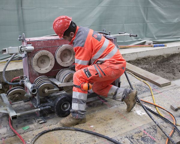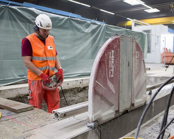 Die Arbeiten führten wir bei laufendem Betrieb und engen Platzverhältnissen aus. Es galt, das alte Fundament und die Bodenplatte von 7,5 x 32 Meter und mit einem Gewicht von rund 260 Tonnen rückzubauen. Zuerst wurde der ölverschmutzte Beton abgefräst, mit dem Saugbagger abgesaugt und in die Reaktorstoffdeponie gebracht. Während Thomas Wisler mit der Wandsäge die Bodenplatte Stück für Stück schnitt, arbeiteten Beat Meyer und Bukurim Pollozhani mit unserer neuen Seilsäge. Bevor aber die Seilsäge starten konnte, mussten sie entlang des alten Fundaments die Erde ausheben und die Microtunnel.ch AG, ein Unternehmen der Witschi Gruppe, erstellte unter dem Fundament mittels Schlagvortrieb Löcher, in die das Seil für die Säge eingezogen wurde. 4,5 Tonnen schwere Stücke luden unsere Bauwerktrenner mit dem praktischerweise vorhandenen Hallenkran in Abrollcontainer. Auf unserem Aufbereitungsplatz wurde der rückgebaute Beton schliesslich maschinell gebrochen und zu wiederverwertbarem Recyclingkies aufbereitet. Nach rund 200 m² Schnittfläche, davon 60 m² mit der Seilsäge, waren die Schneidarbeiten beendet. Die Seilsäge erbringt eine höhere Schnittleistung als die Tauchsäge, daher lohnt sich bei solchen Projekten der Einsatz von beiden Sägetypen. Reto Zeindler, Leiter Betonbohren und Schneiden, steckte viel Planungsarbeit in die ausführungstechnischen Details. Er konnte Peter Roth, Projektleiter Umbau der Jorns AG, mit seiner Idee überzeugen.