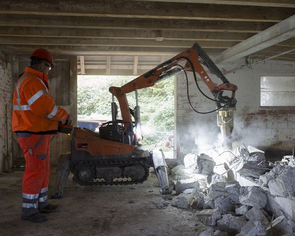 Die Leistung des Abbruchroboters entspricht etwa einem zwei Mal schwereren konventionellen Bagger. Er ist aber so klein, dass er durch alle normalen Türöffnungen passt. Sogar Treppen steigen kann er. Dank der individuell gesteuerten Ausleger ist er in der Lage, auf unebenen Flächen oder nahe an Wänden zu arbeiten. Ein weiterer wichtiger Vorteil ist der Elektroantrieb: Im Gegensatz zu Maschinen mit Verbrennungsmotor arbeitet er emissionsfrei und kann daher problemlos in fast allen Innenräumen eingesetzt werden. Der wendige Arm ist um 360 Grad drehbar, daher muss der Roboter weniger oft bewegt werden – ein entscheidendes Plus in engen Räumen.