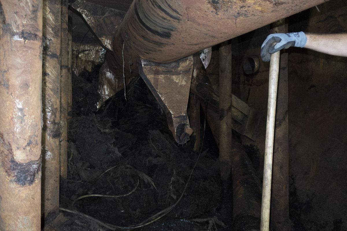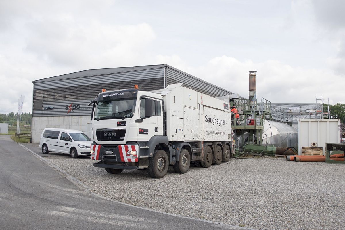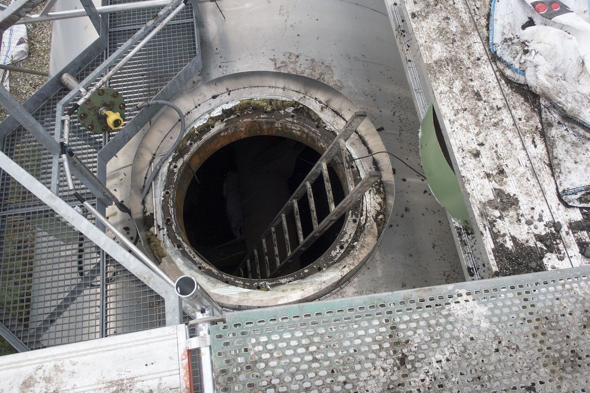 Infolge abgerissener Padel am Rührwerk des Fermenter (Gärreaktor) konnte das Material nicht mehr richtig durchmischt werden, worauf sich Klumpen bildeten wie riesige, mehrere hundert Kilo schwere Wollknäuel. Mit dem Witschi Saugbagger und einem starken, sechsköpfigen Team wird der Fermenter ausgeräumt.