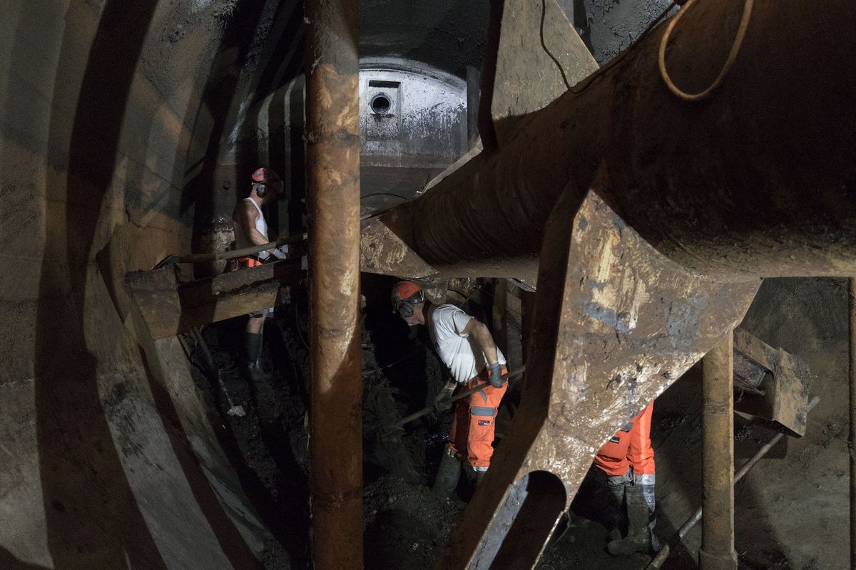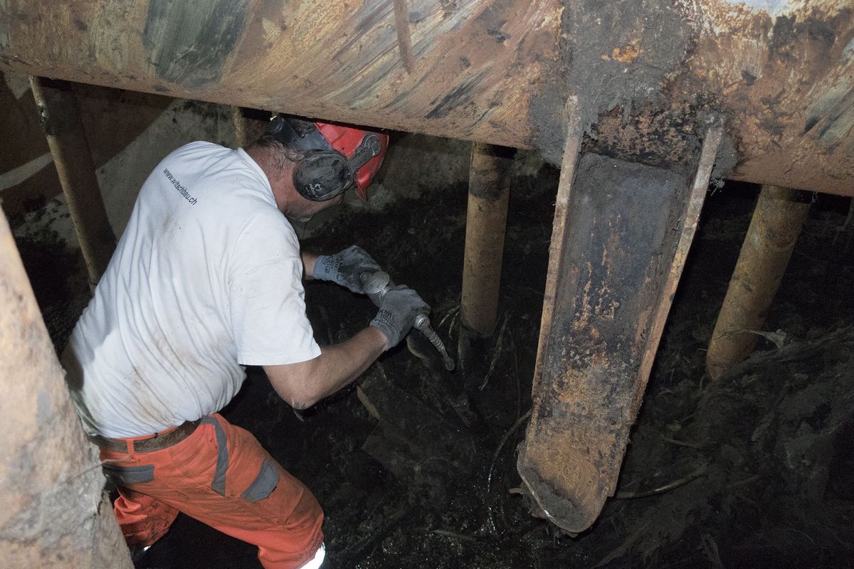 Der Arbeitsort im engen, stickigen Silo, sowie der unebene Boden und das Rührwerk in der Mitte des Reaktors erschweren die Arbeit zusätzlich. Massive Kiesablagerungen müssen mit dem Luftdruckspatel gelöst werden.