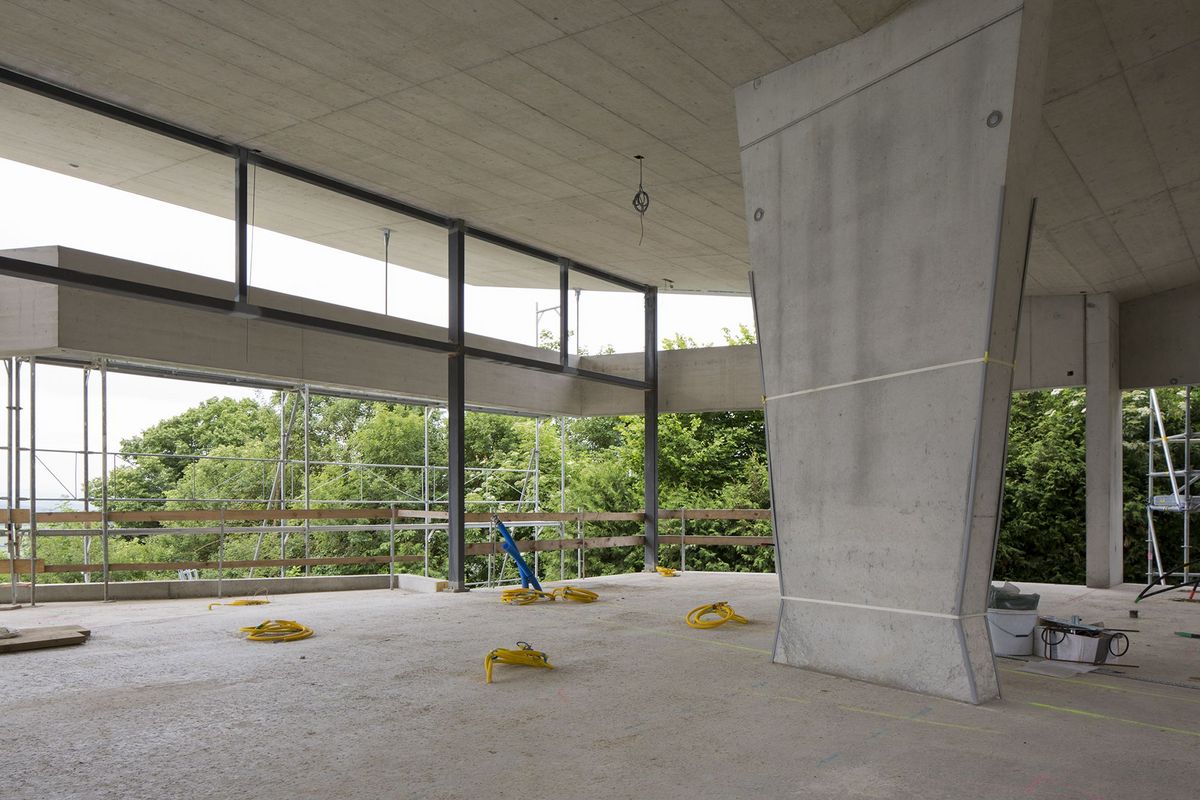 Das Ingenieurbüro Emch+Berger AG, mit Claudio Romere als federführendem Ingenieur, hat das ganze hochkomplexe Ingenieurbauwerk statisch berechnet und somit auch die Realisierung gewährleistet. Das Schmetterlingsdach und ebenso das Band rund ums Haus sind auch für Polier Mathias Pante und sein Team nicht alltägliche Herausforderungen. Das Baugerüst und die Deckenschalung mussten die rund 480 Tonnen Beton für das Dach tragen können. Mit mehreren Seilen wurde die Schalung festgezurrt, damit sie durch den Zug nicht runterfällt.