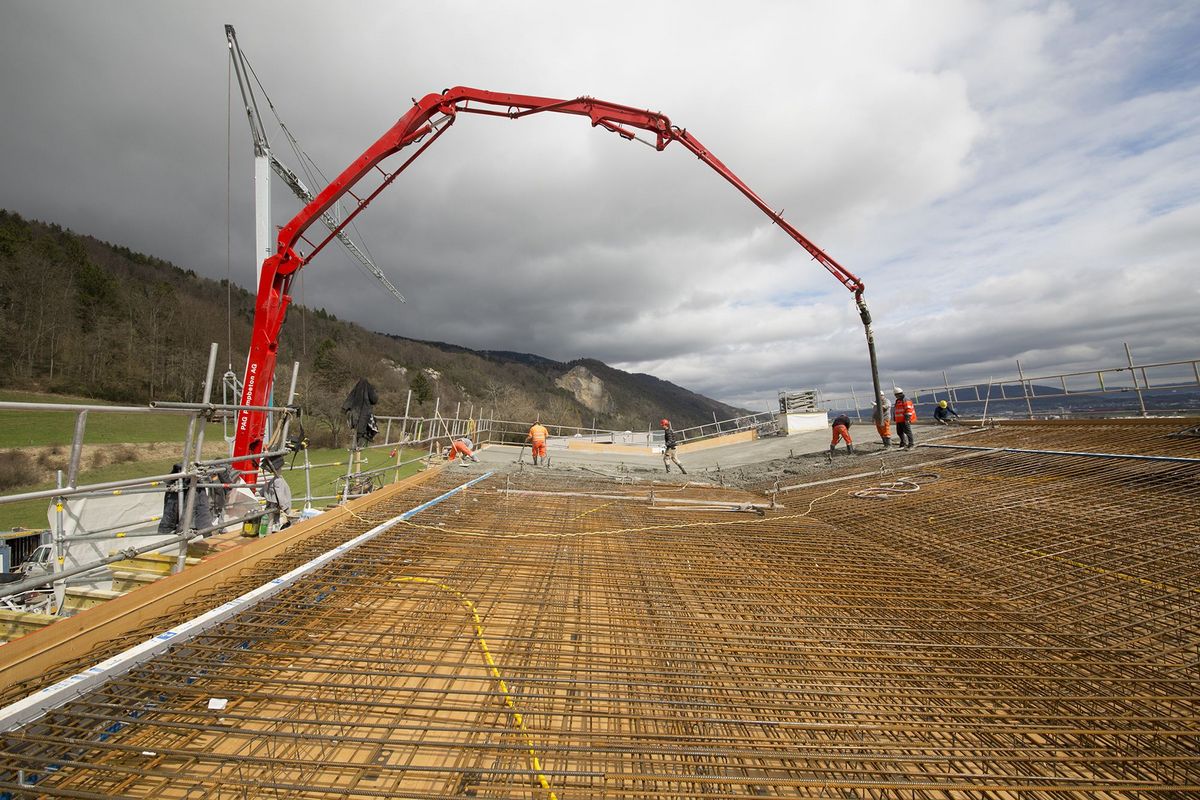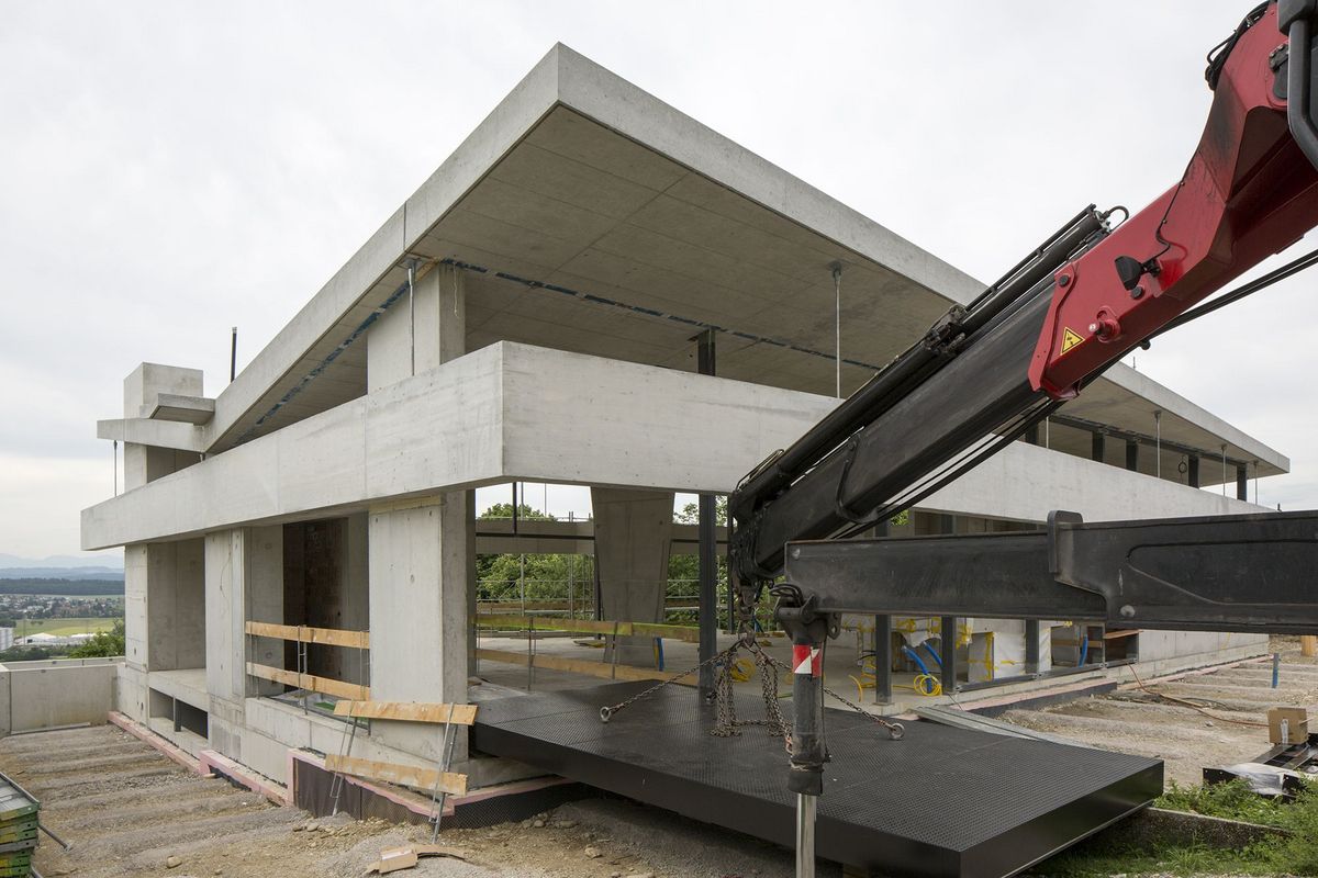 In Oberbuchsiten am Jurasüdhang entsteht ein eindrücklicher Bau aus Sichtbeton und Glas. Ein grosszügiger Wohnraum, eine Terrasse mit Schwimmbad und eine Garage mit Autolift erstrecken sich über zwei Stockwerke.