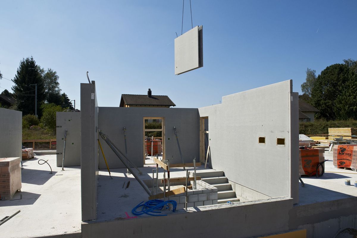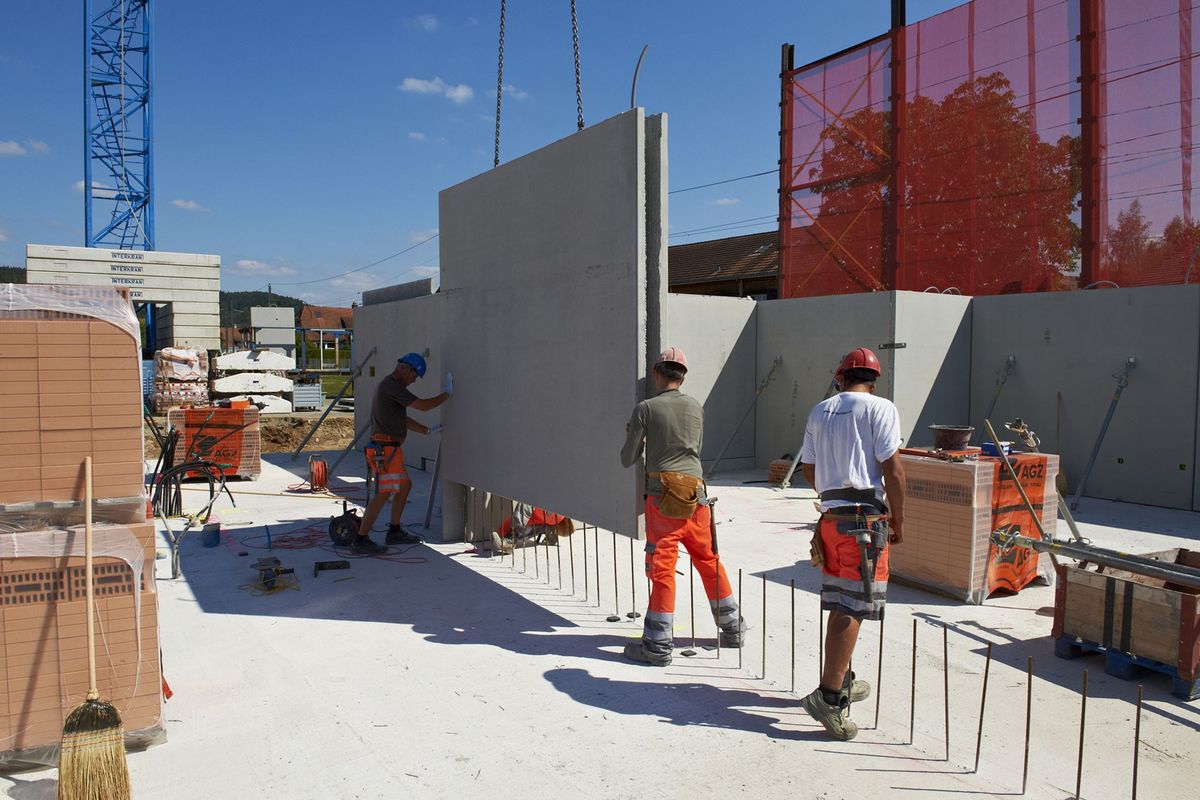 Alle Betonwände und die Decken bestehen aus vorgefertigten Elementen, die von Lieferanten in Deutschland hergestellt werden. Die Elemente werden gleich nach dem Stellen mit selbstverdichtendem Beton gefüllt.