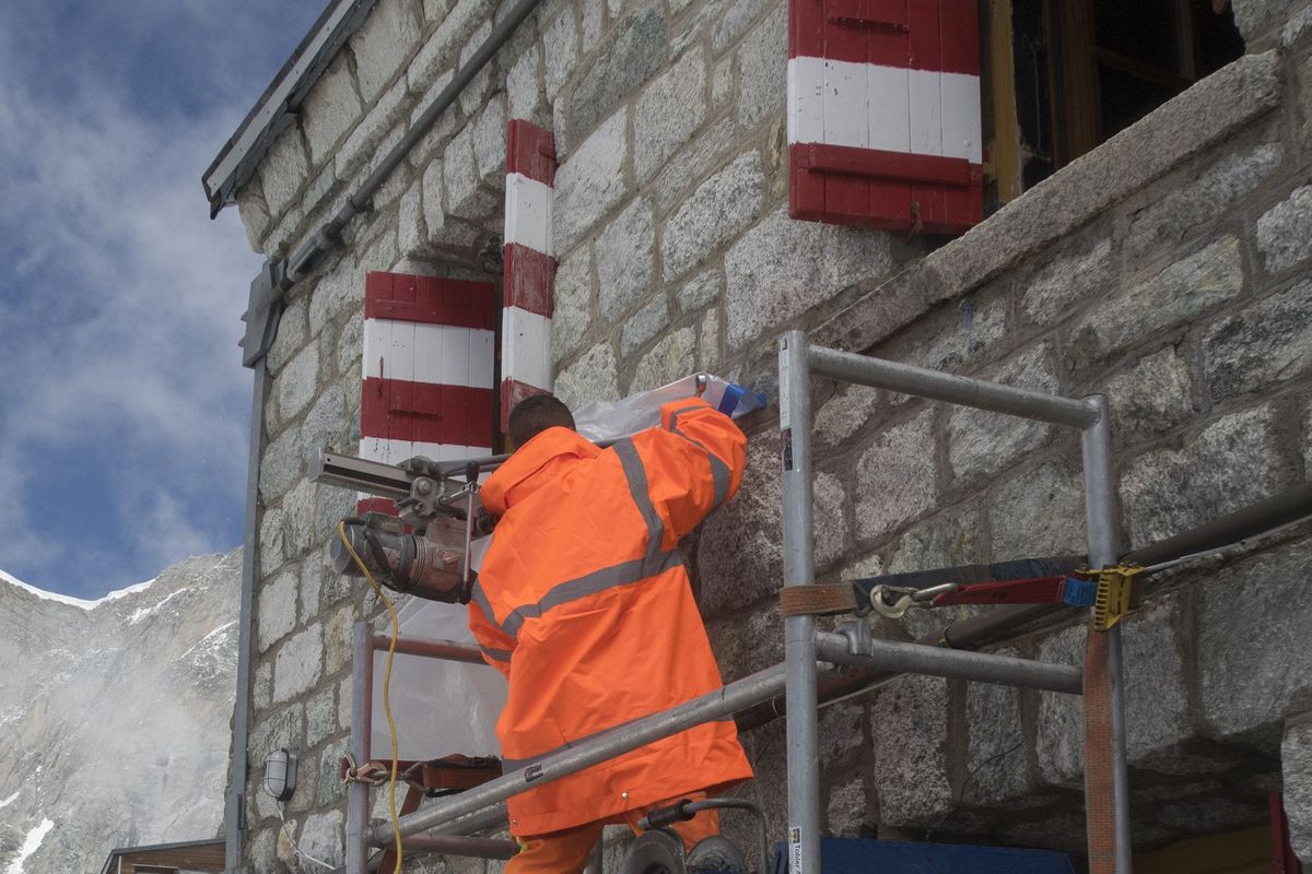 „Wir hatten mit einigen Schwierigkeiten zu kämpfen. Das geplante Gerüst war für die Arbeiten zu tief, aus diesem Grund mussten wir spontan eine Lösung finden. Wir entschieden uns, das Gerüst auf die nötige Höhe zu verlängern. Und die Natursteine der Hauswand waren dicker als gedacht, wir mussten noch mal ins Tal gehen und unser Inventar für die Kernbohrung aufrüsten.“ Martin Fellmann