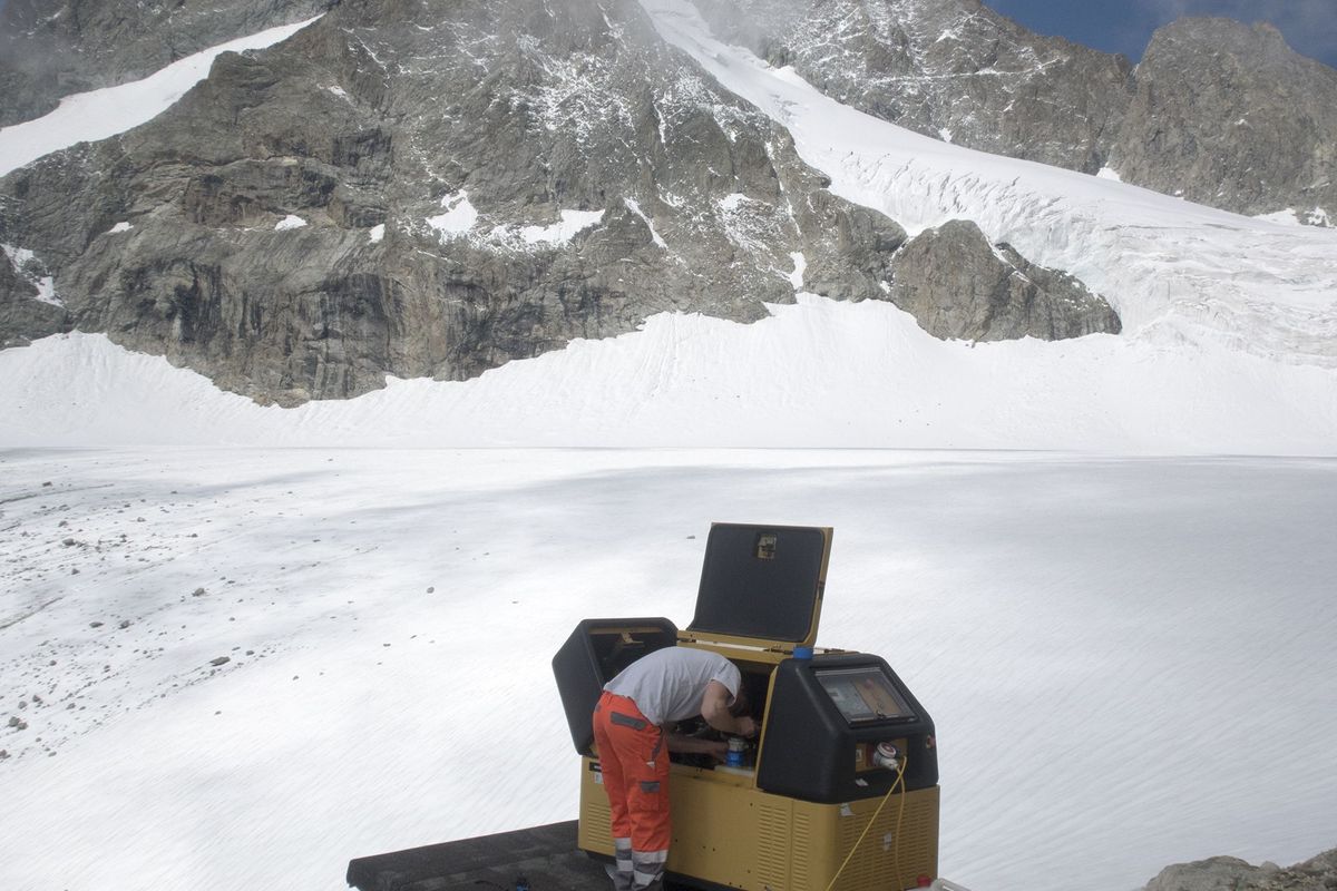 „Am zweiten Tag wechselte ich den Keilriemen beim Notstromaggregat. Dieser ist sehr wichtig für eine einwandfreie Funktion. Danach machte ich mich bereit für den Abflug ins Tal. Diesmal jedoch nicht mit dem Helikopter, sondern mit Michael Witschi und seinem Gleitschirm. Wir sind von einem Schneefeld aus gestartet und flogen zurück ins Tal. Trotz leichter Nervosität beim Start war dies ein tolles Erlebnis, das ich hoffentlich nicht zum letzten Mal erleben durfte. Ich ging früher zurück als die anderen, denn wir hatten viel zu tun in der Werkstatt.“ Dominik Hofer