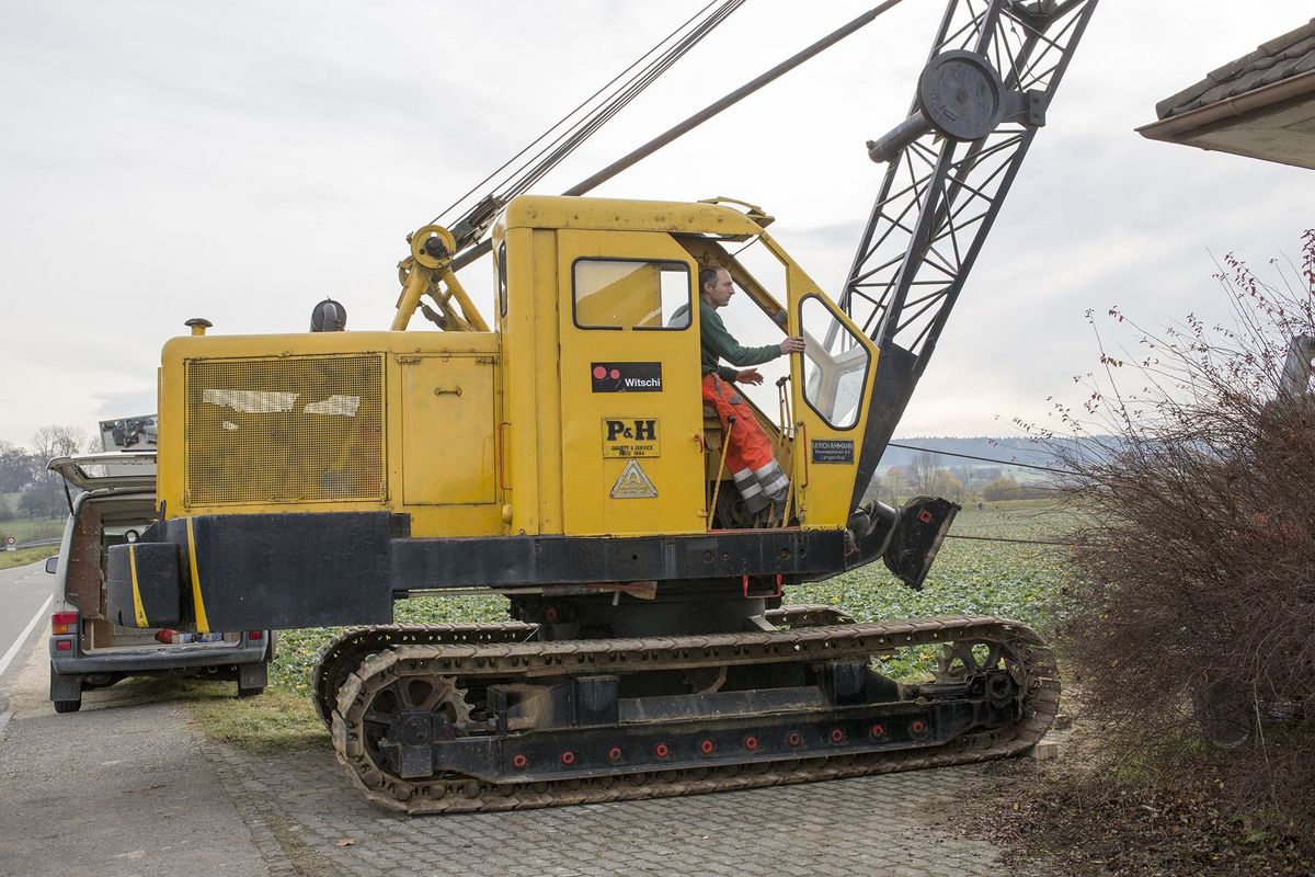 Kürzlich erhielt die Witschi AG den Auftrag, den Schacht wieder vom Geröll zu befreien. Da kein Plan über die Dimensionen des Schachtes bestand, wussten wir nicht, welches Geröllvolumen uns erwartete. Wir begannen mit dem Saugbagger mit senkrecht hängendem Schlauch das aufgefüllte Material herauszusaugen. Der Schacht hatte bis 5 Meter Tiefe einen Durchmesser von einem Meter, danach nur noch 80 cm. In einer Tiefe von 17 Metern stiessen wir auf Grundwasser. Da im Grundwasser nicht mit dem Saugbagger gesogen werden kann – man würde nur Wasser einsaugen –, war eine andere Lösung gefragt. Wir entschieden uns, den Grossonkel des Saugbaggers einzusetzen: den 47-jährigen P + H Seilbagger.