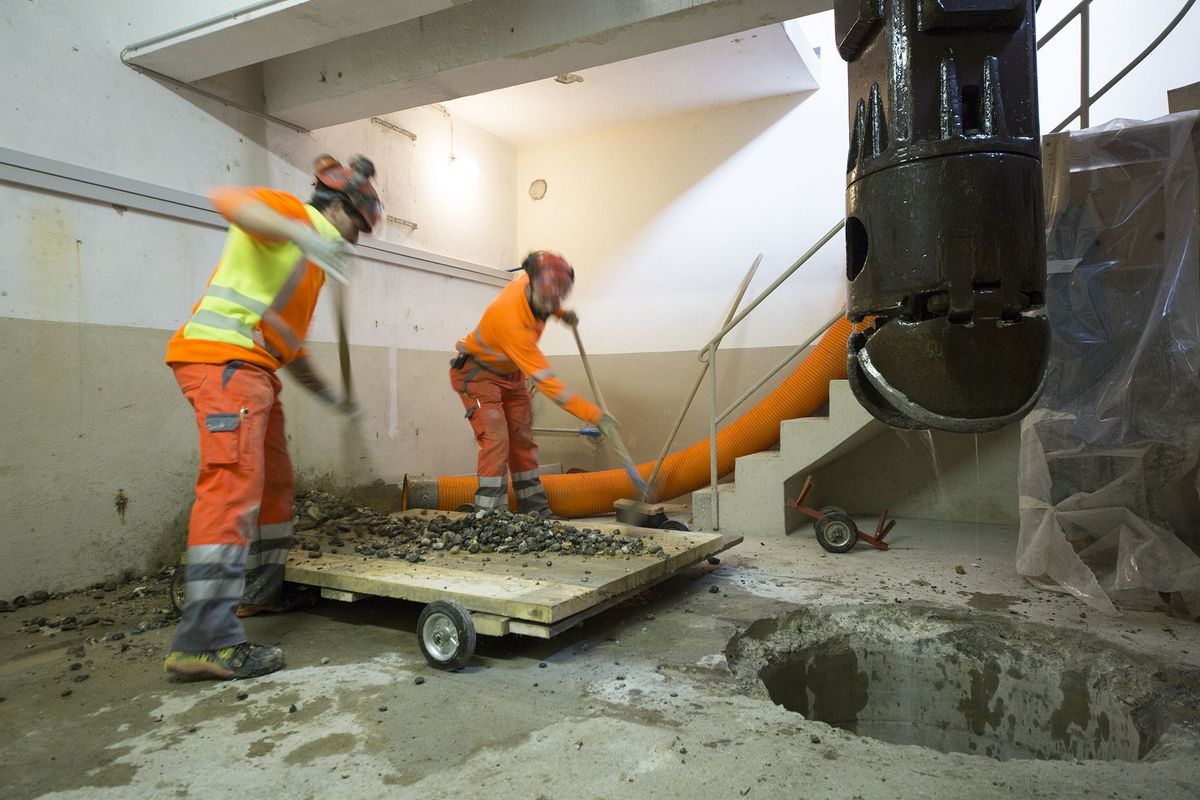 Der Schacht befindet sich im Keller und ist mit dem Seilbagger nicht direkt erreichbar. Deshalb und weil das Gebäude von 1951 seitlichen Umlenkkräften nicht standhält, bauten wir eine Konstruktion, welche die Vertikalkräfte in Horizontalkräfte umleitet, ohne das Gebäude zu belasten. Das Trag- und das Arbeitsseil des Seilbaggers wurden über vier Umlenkrollen in den Schacht geführt. Somit hatten wir an der Tragkonstruktion ein Zuggewicht von gut fünf Tonnen. Dafür mussten unsere Bauwerktrenner ein grosses Loch in den Boden schneiden.