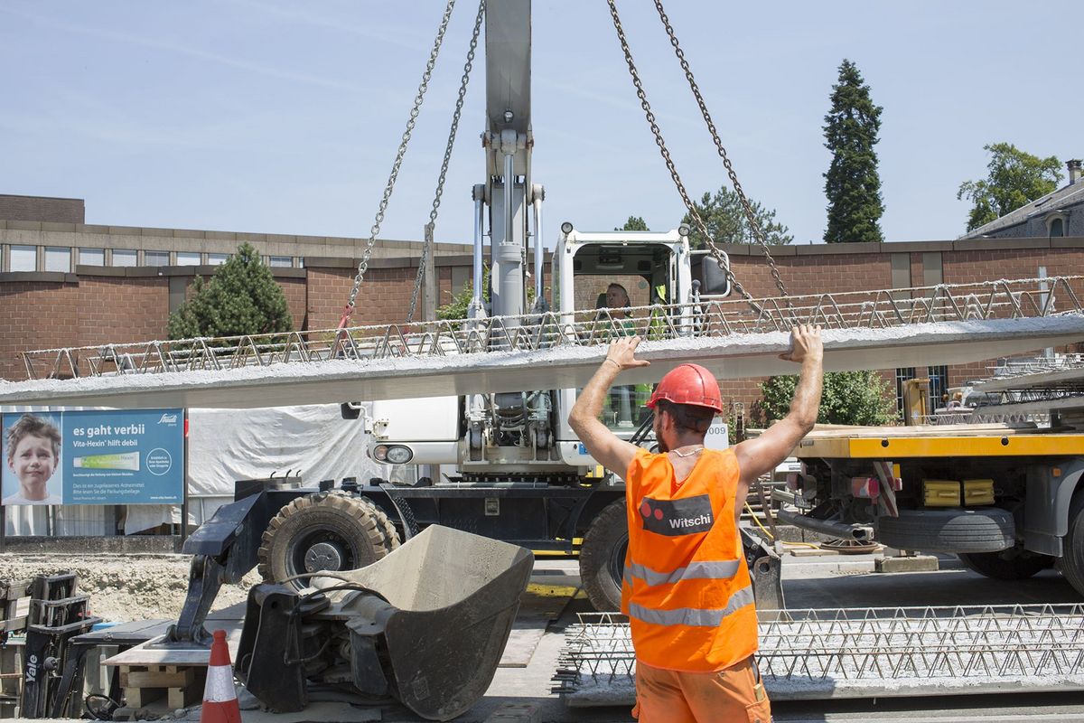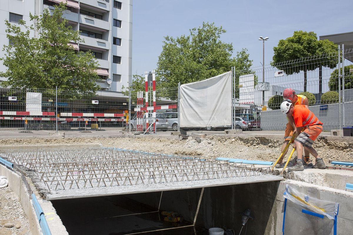Unter dem untersten Teil der Bahnhofstrasse wurde der Kanal, von dem viele Langenthaler gar nicht wissen, dass er existiert, im Sommer 2017 freigelegt. Das von Geschäftsleitungsmitglied Roman Gerber und Polier André Gabi geleitete Team entfernte die alten Deckenplatten und sanierte die Kanalwände. Dann wurden die vorgefertigten neuen Deckenplatten eingesetzt und auf eine Höhe von 30 cm aufbetoniert. Die Verwendung von vorgefertigten Elementen ersparte den Einsatz von Schalungen. Am Schluss überzogen unsere Betonspezialisten die Kanaldecke mit einer 3 cm dicken Schicht Ultrahochleistungs-Faserbeton (UHFB). Durch den Einsatz des innovativen Baumaterials verkürzt sich die Bauzeit gegenüber herkömmlichen Abdichtungen um einen Monat. So schritt die Sanierung des etwa 70 Meter langen Stücks trotz enger Platzverhältnisse rasch voran. Das nützte allen Verkehrsteilnehmern, die während der Arbeiten auf die Jurastrasse ausweichen mussten. Für die vielen Pendler blieb während der ganzen Bauzeit ein Fussweg offen. Der Stadt Langenthal brachte das Projekt den Vorteil, dass mit der Kanalsanierung auch gleich der Strassenbelag erneuert wurde.