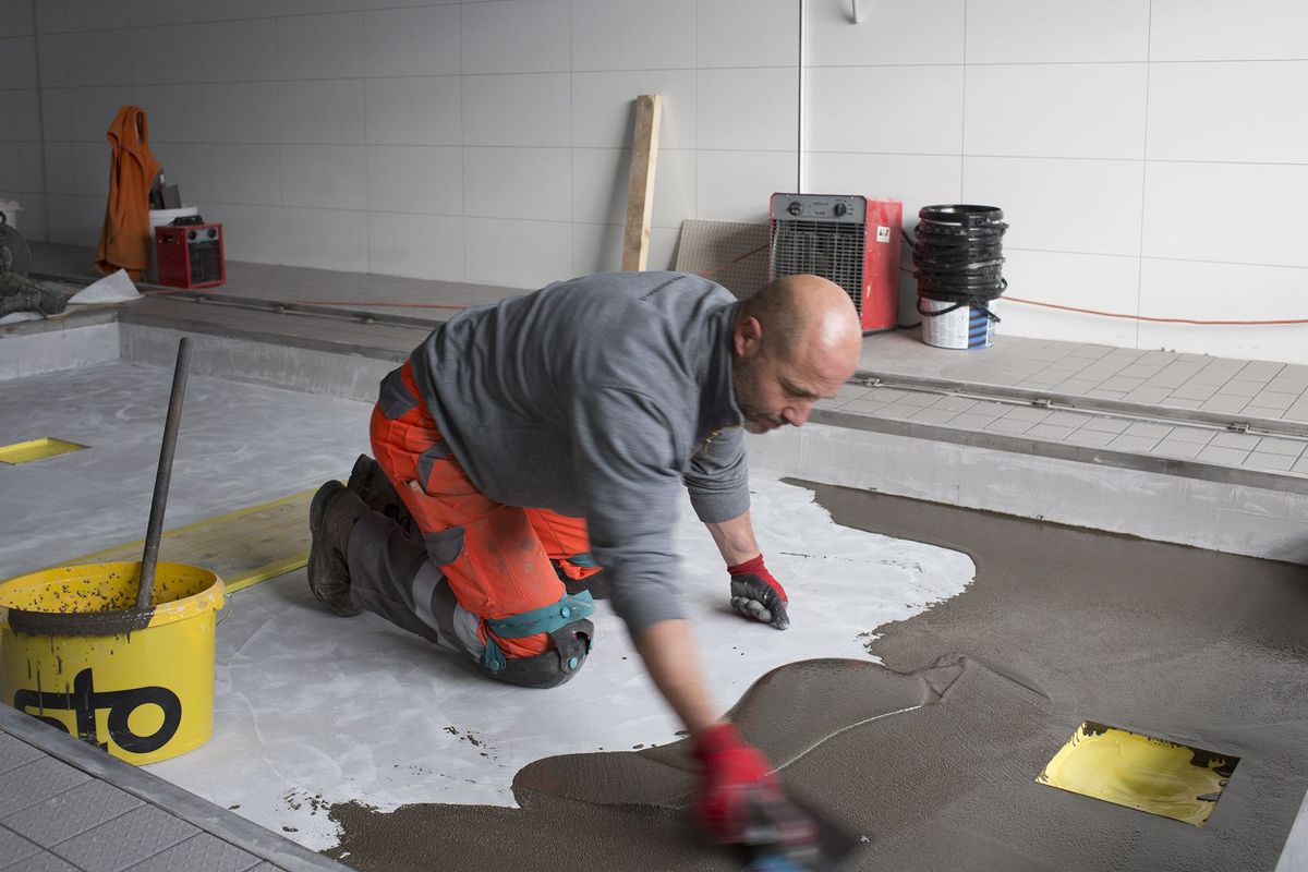Um den Umbau der neuen BMW-Garage rechtzeitig fertigzustellen, müssen alle Handwerker zur gleichen Zeit auf der Baustelle sein. Im Waschraum arbeiten gleichzeitig drei Arbeitsgattungen. Wir beschichten die Öl-Auffangwanne, während der Bodenleger Platten legt und Stahlträger für den Autolift montiert werden.
