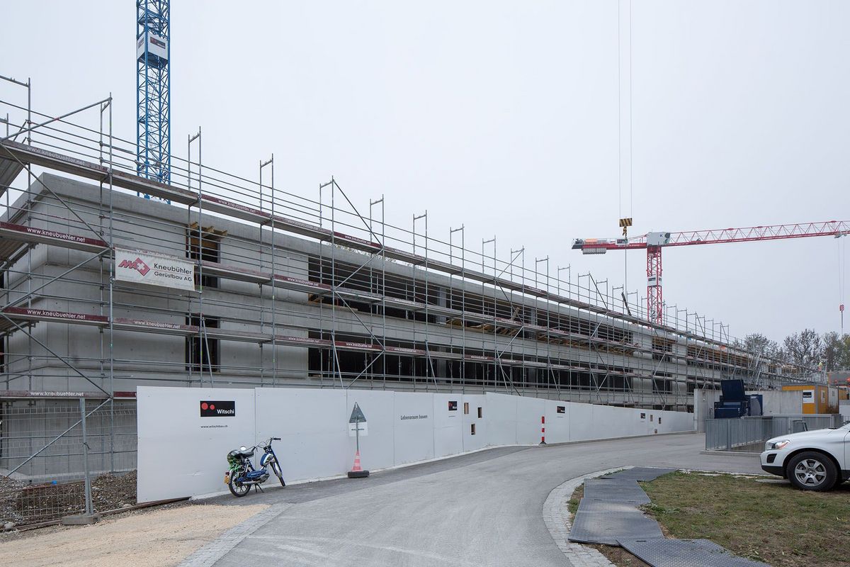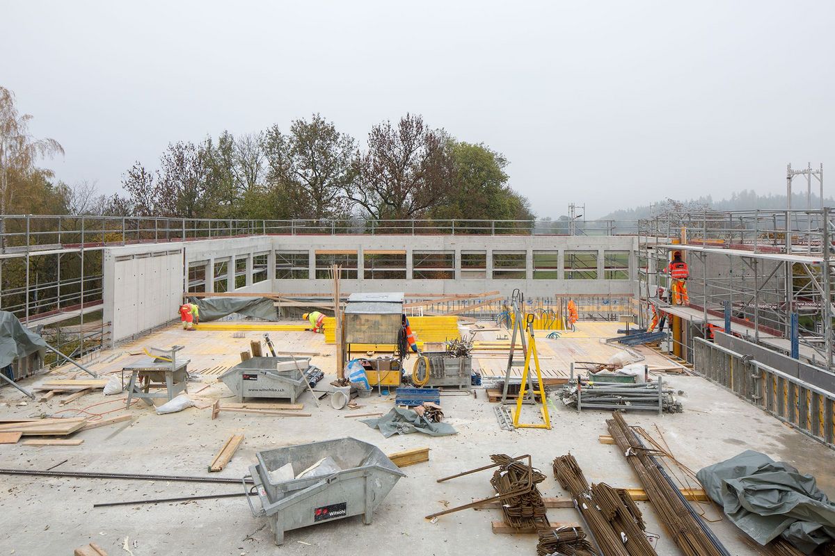 Die Witschi AG erhielt den Auftrag zur Ausführung des Aushubs und der Hochbauarbeiten aufgrund ihrer grossen Erfahrung im Bereich Betonbau. Innerhalb von drei Wochen wurde der bestehende Parkplatz rückgebaut. Insgesamt 12 000 m3 Aushubmaterial wurde auf Lastwagen verladen. Danach verbaute das Team von Bauführer Jannik Spano und Polier Marc Däpp in rund 130 Tagen 7000 m3 Beton und 526 Tonnen Eisen. Das trockene Wetter erleichterte das Einhalten des engen Terminplans. Bei der Sichtbeton-Fassade wurde kaum etwas dem Zufall überlassen. Die Architekten planten die Position sämtlicher Bindstellen und Fugen. Damit die Fugen der Zwischendecke von vorne nicht sichtbar sind, wurden die Wände mit den speziell für diesen Bau angefertigten Schalelementen auf die Gesamtbauhöhe von acht Metern betoniert. Die Zwischendecke wurde nachträglich von hinten angehängt.